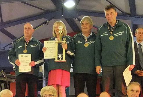 Sulzfelder Minigolfer gewinnen Deutsche Meisterschaft Abt. 2 DM in Eibenstock / Sachsen erfolgreich beendet Eine sehr positive Bilanz können die vier Senioren des MGC Sulzfeld bei ihrer Teilnahme an der Abt. 2 Deutsche Meisterschaft, die vom 23. bis 25. August in der Miniaturgolfhalle im sächsischen Eibestock stattfand, ziehen. Um sich auf der sehr schweren Anlage intensiv vorbereiten zu können waren die Kraichgauer schon eine Woche zuvor angereist. So startete das Quartett gut vorbereitet in den Meisterschaftskampf. An den beiden ersten Spieltagen mussten täglich drei Runden absolviert werden. Diese zählten für die Mannschaftswertung und gleichzeitig auch zur Qualifikation für die Zwischenrunde im Einzel. Am ersten Tag war das Sulzfelder Team gut gestartet und konnte sich mit der Mannschaft auf den vorderen Plätzen behaupten. Am zweiten Tag setzte sich Sulzfeld dann zusammen mit den Teams von Ludwigshafen und Höchberg von den Verfolgern und machten so im weiteren Verlauf den Meister unter sich aus. Bei diesem Dreikampf, der bis zum Schluss spannend blieb, hatten am Ende die Sulzfelder mit nur einem Schlag Nase vorne. Somit war es geschafft die Deutsche Senioren-Mannschaftsmeisterschaft 2012 der Abt. 2 ging an den MGC Sulzfeld. Auch in der Einzelwertung lief es für die Senioren aus dem Kraichgau gut. Alle 4 Teilnehmer hatten die Zwischenrunde erreicht. Bertold Großmann, der nach der Vorrunde bei den Senioren I noch als Meisterschaftskandidat gehandelt wurde, konnte in der Zwischenrunde leider nicht mehr an ganz an die Leistung aus der Anfangsphase anknüpfen und belegte am Ende mit 220 Schlägen (Ø 24,444) einen sehr guten 6. Platz und war damit am Ende schlaggleich mit Jürgen Pfisterer der sich im Turnierverlauf immer weiter steigern konnte. Mit 227 Schlägen (25,222) erzielte Jürgen Summ, der am zweiten Tag mit gesundheitlichen Problemen zu kämpfen hatte, einen beachtlichen 13. Platz. Den Erfolg der Sulzfelder Senioren runde Helga Haug bei den Seniorinnen II ab. Mit 292 Schlägen belegte sie den hervorragenden dritten Platz.