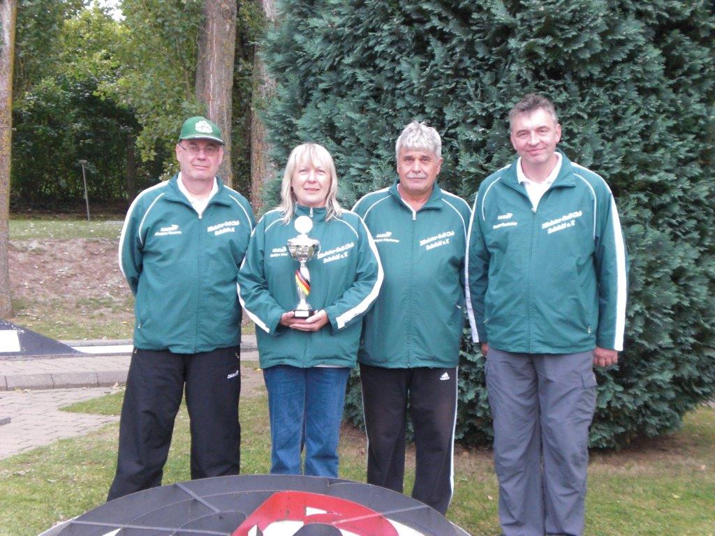 Sulzfelder Minigolfer sind wieder Deutsche Meister Deutsche Mannschaftsmeisterschaft erfolgreich verteidigt Mit der erfolgreichen Titelverteidigung endete für die Senioren des MGC Sulzfeld die Teilnahme bei der Abt. 2 Deutschen Meisterschaft, die vom 15. bis 17. August im südpfälzischen Rodalben stattfand. Um sich auf der gewöhnungsbedürftigen Anlage intensiv vorbereiten zu können waren die Kraichgauer schon eine Woche zuvor angereist. So startete das Quartett gut vorbereitet in den Meisterschaftskampf. An den beiden ersten Spieltagen mussten täglich drei Runden absolviert werden. Diese zählten für die Mannschaftswertung und gleichzeitig auch für Einzelwertung. Am ersten Tag war das Sulzfelder Team allerdings schwach gestartet und belegte so nur den fünften Platz. Da der Rückstand auf die davor platzierten Mannschaften nicht allzu groß war, machte sich das Team noch Hoffnungen unter die Top Drei zu kommen. Am zweiten Tag spielte Sulzfeld dann eine hervorragende Startrunde und verbesserte sich so auf den dritten Platz. Nach einem ebenfalls sehr guten fünften Durchgang ging das Team sogar mit knappem Vorsprung in Führung. In der Schlussrunde konnten die Sulzfelder den Vorsprung sogar noch auf 6 Schläge ausbauen. Somit war es geschafft, die Deutsche Senioren-Mannschaftsmeisterschaft 2013 der Abt. 2 ging an den MGC Sulzfeld. Auch in der Einzelwertung lief es für die Senioren aus dem Kraichgau gut. Bei den Senioren I konnten alle 3 Teilnehmer die Zwischenrunde erreichen. Am Ende verfehlte als 12. Jürgen Pfisterer mit 217 Schlägen (Ø 24,111) knapp die Top Ten. Mit 214 Schlägen (Ø 23,778) belegte Jürgen Summ einen sehr guten 8. Platz. Den 6. Platz sicherte sich Bertold Großmann mit hervorragenden 209 Schlägen (Ø 23,222). Den Erfolg der Sulzfelder Senioren runde Helga Haug bei den Seniorinnen II ab. Mit 175 Schlägen (Ø 29,167) belegte sie den 4. Platz.